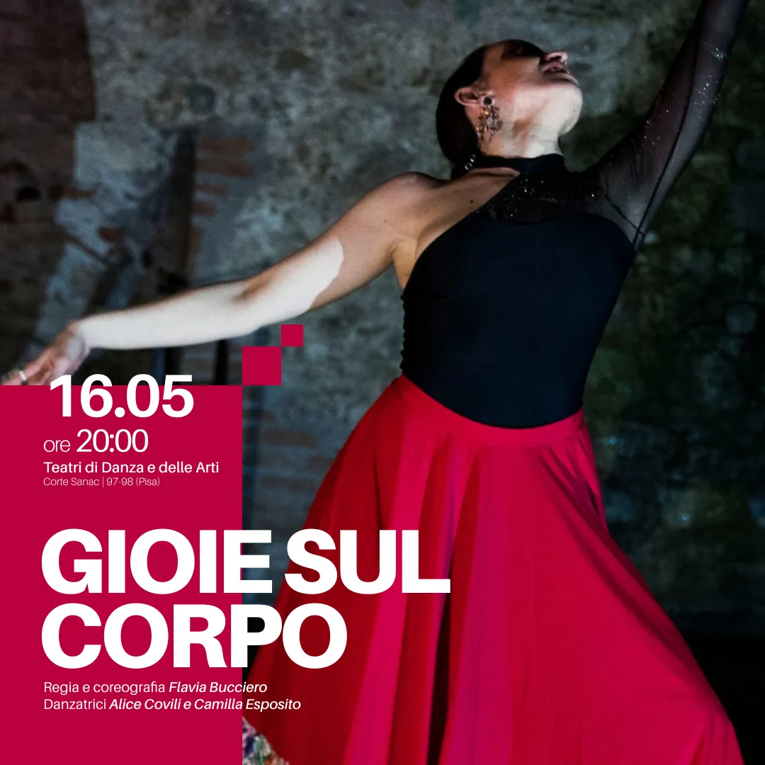 “Gioie sul corpo” è una performance di danza della Compagnia Con.Cor.D.A./Movimentoinactor con la coreografia di Flavia Bucciero e le danzatrici Alice Covili e Camilla Esposito. Lo spettacolo si ispira ad un Oriente immaginario, filtrato da una creatività, tutta italiana. I rimandi musicali sono ispirati ad arie pucciniane.