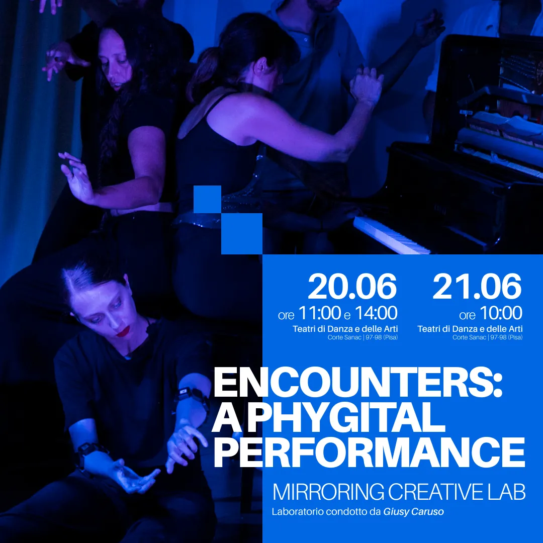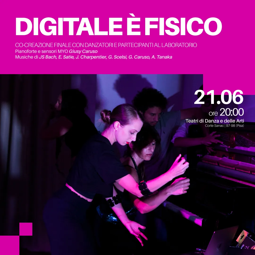 In occasione della Festa della Musica, a conclusione del laboratorio condotto da Giusy Caruso con i danzatori e i musicisti, va in scena la co-creazione finale. Il corpo non è più soltanto materia, ma interfaccia: vibra, si moltiplica, si frammenta nel dialogo continuo con la dimensione digitale. Gesti minimi attivano spazi virtuali, ritardi e riverberi tecnologici deformano la visione, mentre il tempo coreografico oscilla tra carne e codice.